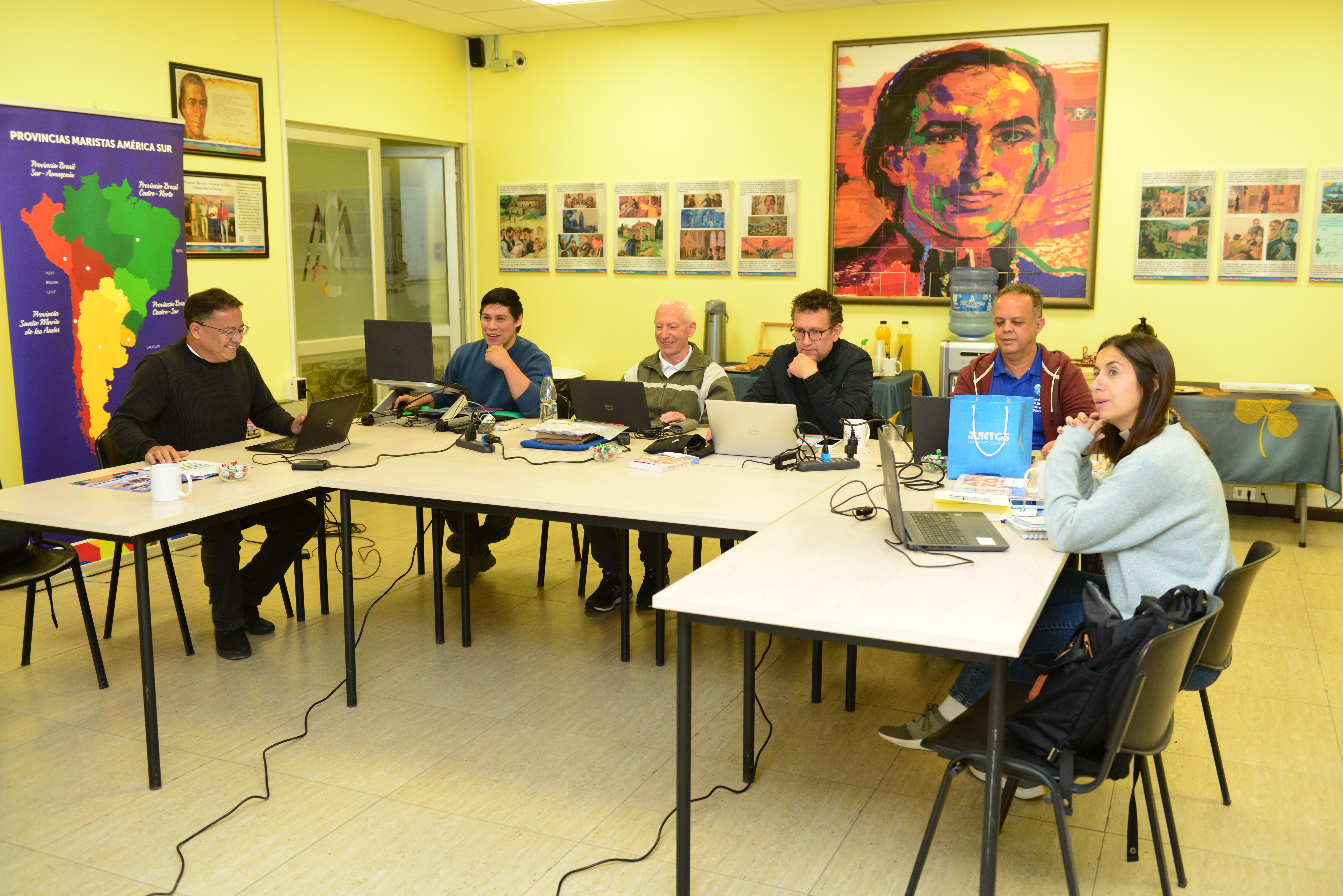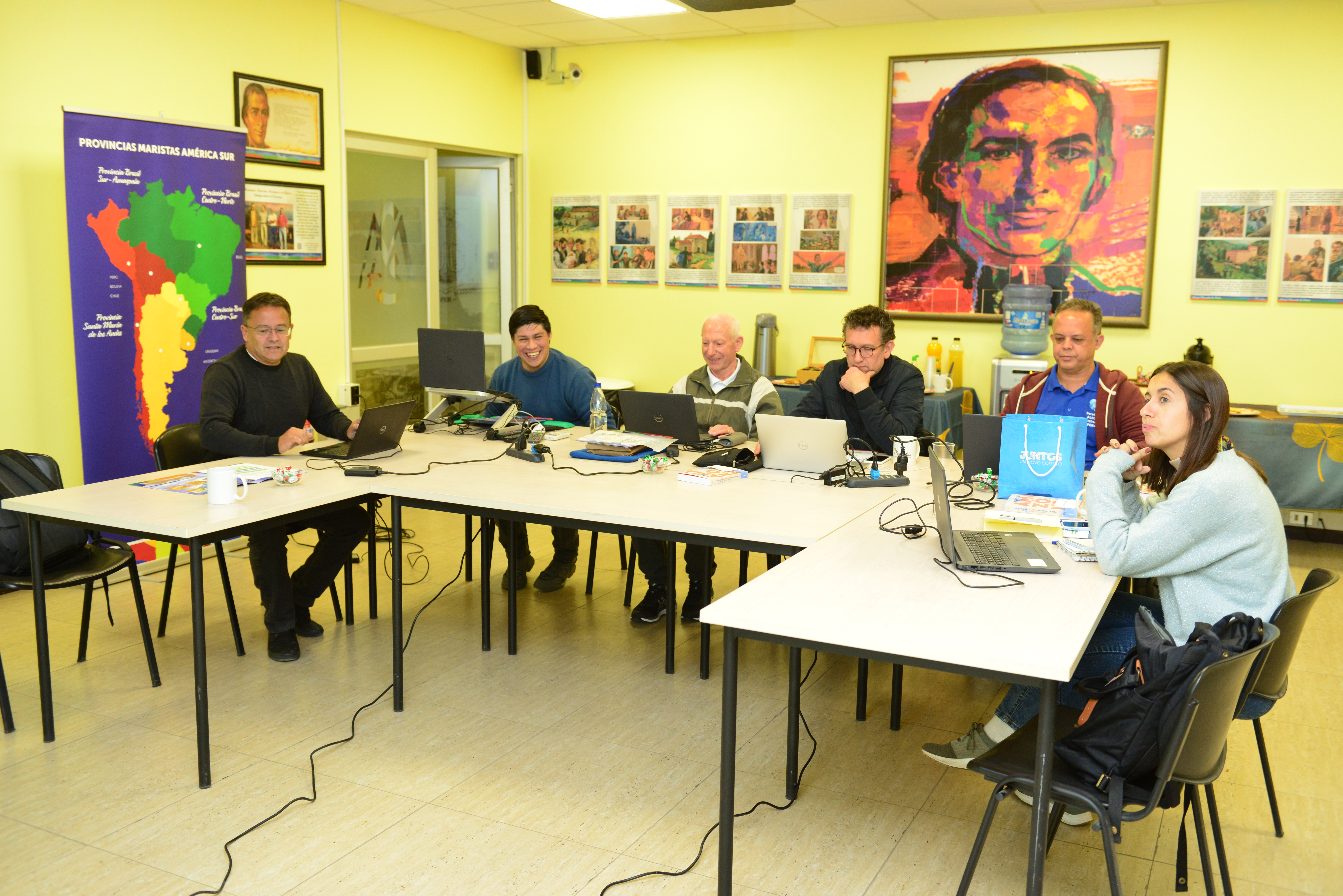 La mañana del miércoles por su parte se centró en torno a los Grupos de referencia de la Región, quienes integran las iniciativas, el caminar de cada una y como se relacionan con la red, para luego definir qué papel cumplen en torno a esta y que iniciativas conjuntas de pueden desarrollar. También se revisó el Plan de Comunicaciones de la instancia, junto con recibir la visita del Delegado de Vida y Misión del Sector Chile, Sr. Ernesto Reyes, quien valoró el aporte que la Red de Centros de Memoria realiza a la Región América Sur. Por la tarde el equipo dio el vamos al Encuentro virtual de la Red de Centros de Memoria, con participación online de los siete países miembros (Argentina, Brasil, Bolivia, Chile, Paraguay, Perú y Uruguay) y finalizó la jornada con la revisión de su reglamento interno.