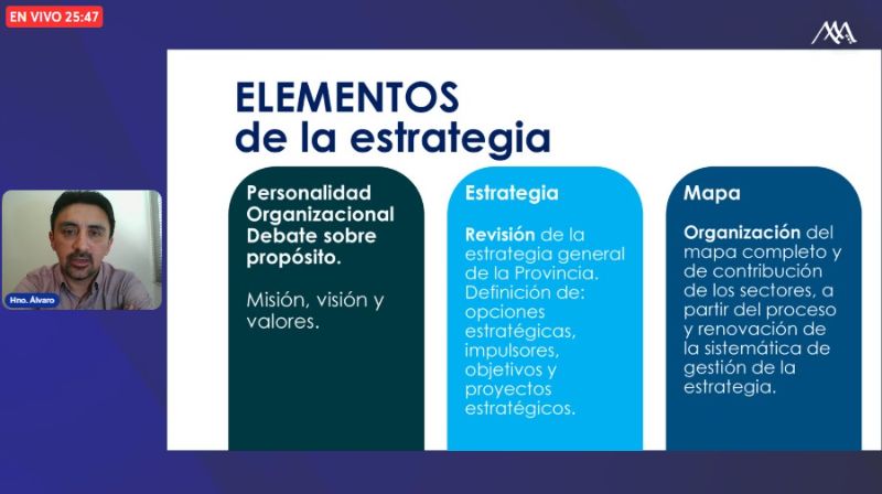 De esta forma el Hno. Diego Rocha explicó cuál ha sido la metodología utilizada para su elaboración, seguido por el Hno. Juan García, que dio cuenta de la personalidad organizacional, entre ellas la Misión, Visión y valores. Finalmente el Hno. Álvaro Sepúlveda, vice provincial, presentó los elementos de la estrategia provincial, los proyectos estratégicos y la implementación del plan. Dentro estos el Hno. Álvaro destacó la relevancia que tienen las Opciones Estratégicas del Plan e hizo un llamado a tenerlas presentes, estas son la Identidad y Sostenibilidad Carismática, la Animación de las Vocaciones, la Calidad Educativa y Evangelizadora y la Unidad Provincial: Animación, Gobernanza y Gestión.